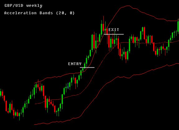 Dua closing harga berturut-turut di luar accelation Bands menyarankan entry point ke arah breakout. Maka entry posisi dipertahankan sampai closing harga berada didalam Bands.