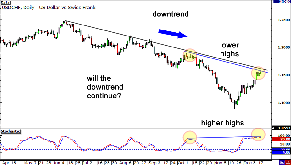 Pertama, mari kita lihat regular divergence. Di bawah ini adalah daily chart USD/CHF.