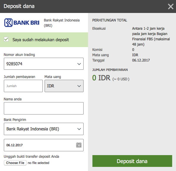 - Isi form berupa jumlah deposit, nomor akun FBS dan nomor rekening bank lokal.