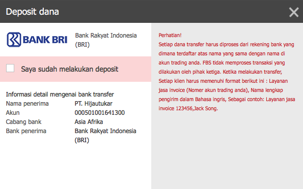 Salah satu keunggulan broker FBS adalah kita bisa melakukan deposit atau penyetoran dana dalam mata uang Rupiah (IDR) melalui bank lokal Indonesia. Saat ini kita bisa melakukan penyetoran dana FBS melalui bank BCA, BNI ,Bank Mandiri, BRI dan OCBC NISP, mungkin kedepannya akan tersedia bank-bank lokal lainnya.