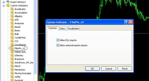 4. Cari nama indiktor yaang anda copy tadi biasanya terdapat pada folder “custom indikator” klik lalu drag ke dalam chart, misalnya pada contoh ini kita menambahka indikator “fibopiv_2”, maka akan muncul seperti gambar berikut:
