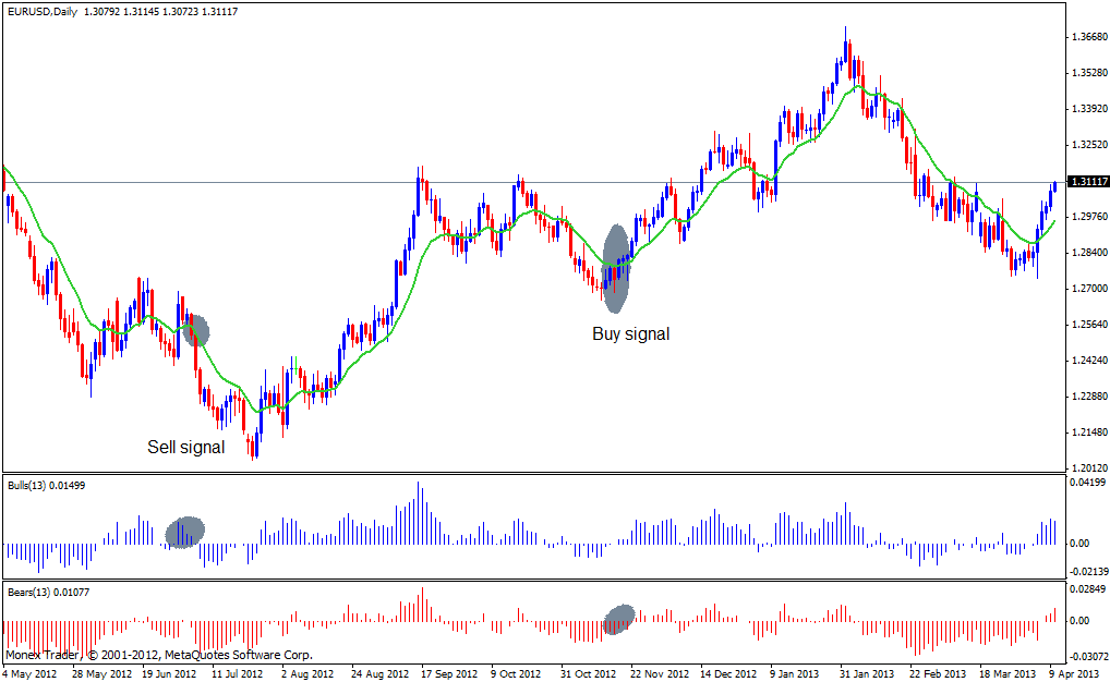 Sama seperti Bulls Power, penggunaan Bears Power sebaiknya disertai indikator tren lainnya, EMA 13. Sinyal buy dapat timbul dengan 2 syarat, yaitu indikator tren sedang naik dan Bears Power negatif tetapi naik. Sinyal buy terkuat adalah ketika indikator diikuti bullish divergence.