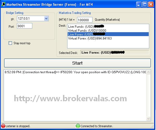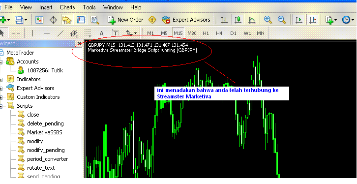 - Sekarang anda bisa memulai trading Marketiva dengan menggunakan Metatrader 4 baik secara manual maupun menggunakan Expert Advisor (EA), segala tindakan anda di Mt4, maka streamster Marketiva akan mengikutinya. Untuk penjelasan lebih detail silahkan baca petunjuknya di file readme.txt pada folder stremaster bridge yang anda download, silahkan mencoba.