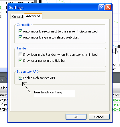 @mustthree: coba cek parameternya, apakh IP di streamster bridge sm sama dengan di MT4, centang semua parameter di tab “common” dan cek jumlah quantity (lot) yang anda open di mt4 apakah tidak melebihi available margin di streamster anda, 🙂