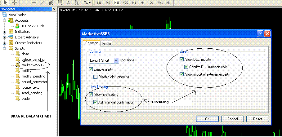 - jalankan MT4, (login dengan akun demo anda) pasang script pada chart dengan cara “DRAG” MarketivaSSBS skript ke Chart, Masukan Parameter yg diperlukan,