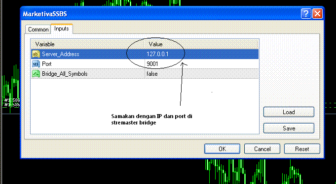 @westprogo: Setting parameter Ip adress dan port pada dialog box yang muncul pada saat script di drag ke Chart, yaitu pada tab “input” samakan dengan IP dan port yang ada pada streamster bridge, sedangkan pada tab “common” centang semua parameter yang ada