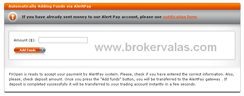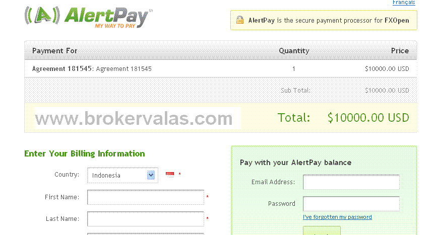 AlertPay adalah suatau layanan jasa pembayaran dan pengiriman uang melalui internet atau secara online dengan aman dan cepat. Untuk melakukan penyetoran dan penarikan dana menggunakan AlertPay terlebih dahulu anda harus memiliki Akun AlertPay, jika belum silahkan registrasi disini. Setelah itu ikut langkah-langkah berikut untuk melakukan penyetoran dana di FXOpen dengan menggunakan AlertPay: