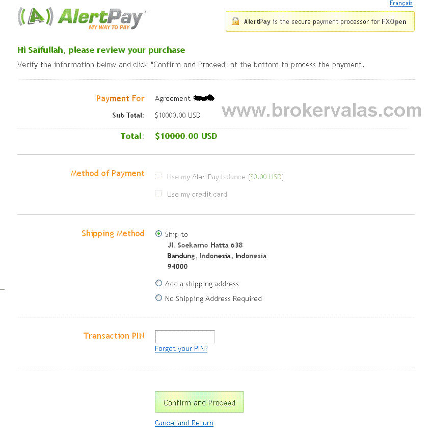 - Pada form tersebut pilih “method of Payment”, ada dua cara pembayaran lewat AlertPay yaitu dengan menggunakan saldo akun ALertPay atau mengunakan kartu kredit anda. pilih salah satunya, kemudian masukkan “PIN” AlertPay (PIN yang anda masukkan pada saat pendaftaran ALertPay), setelah itu klik tombol “Confirm and Procces” untuk menyelesaiakn transaksi anda.