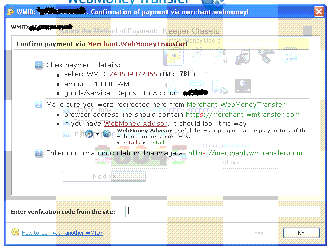 - Pastikan bahwa aplikasi WebMoney sudah dijalankan, silahkan download aplikasi WebMoney disini, catat baik-baik kode verifikasi yang muncul pada halaman diatas, kemudian klik tombol “Next”, maka secara otomatis anda akan terhubung ke aplikasi WebMoney sperti gambar berikut:
