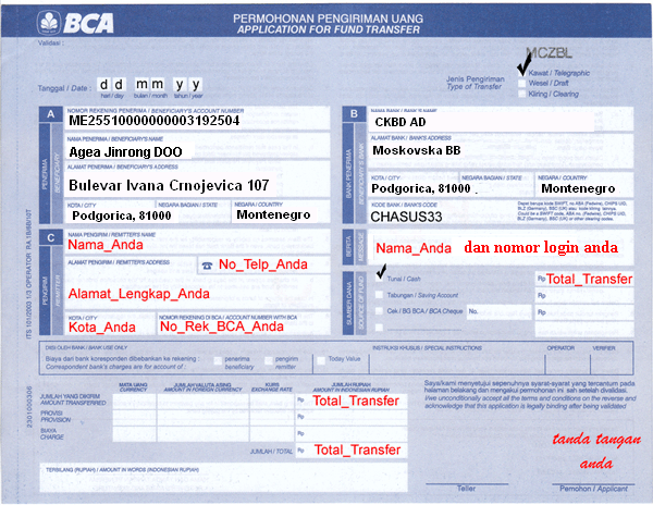 Intermediary SWIFT Code: SCBLUS33Berikut contoh pengisian Formulir trasnfer antar bank menggunakan Bank BCA: