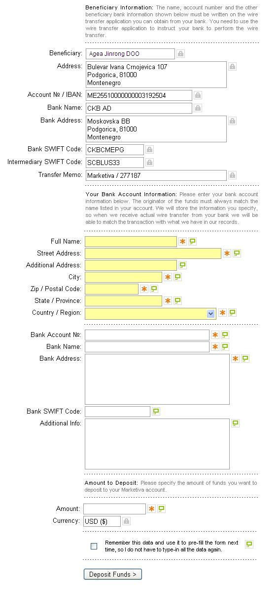 Untuk deposit di AGEA dengan menggunakan wire transfer (transfer keluar negeri) biasa butuh waktu 1-3 hari kerja. Karena account anda di AGEA dalam bentuk dollar Amerika, maka pada saat transfer dana anda akan otomatis di konversi ke USD dengan menggunakan kurs saat itu. Deposit dengan menggunakan wire transfer dikenakan biaya kirim ± USD25. Berikut langkah-langkah untuk cara deposit di agea menggunakan wire transfer: