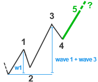 Kemudian ketika gelombang 3 selesai kita dapat menambahkan lagi proyeksi target harga kedua mungkin untuk gelombang 5. Untuk melakukannya kita harus memeriksa gelombang 3: jika gelombang 3 lebih besar dari 161,8% dari gelombang 1, target untuk gelombang 5 akan menjadi 100% dari Wave 1, atau 161,8% dari gelombang 1. Jika gelombang 3 kurang dari 161,8% dari panjang gelombang 1, gelombang 5 sering akan diperpanjang dengan target minimal 61,8% dari gelombang gelombang 1 + 3.