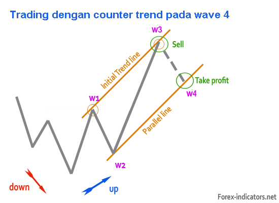 Jika Anda ingin mencoba trading dengan counter-tren Wave 4, target profit Anda untuk posisi Selll baru akan berada disekitar 38,2% – 50% pada tingkat fibonacci retracement, serta sekitar band yang lebih rendah dari Channel baru (lihat contoh di bawah).