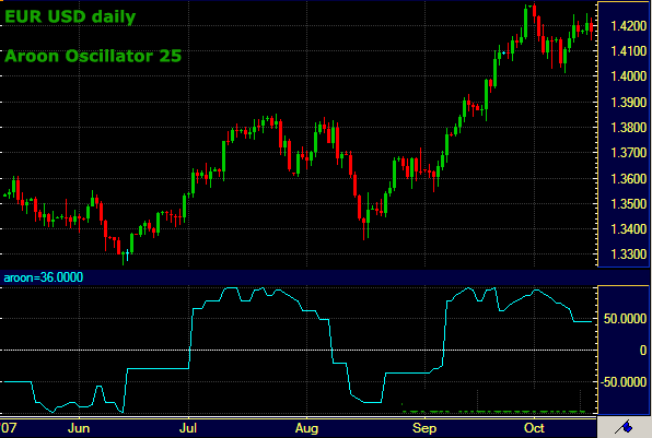 Ini berosilasi sekitar garis nol, menentukan saat-saat AroonUp dan AroonDown garis Aroon Indikator saling silang.