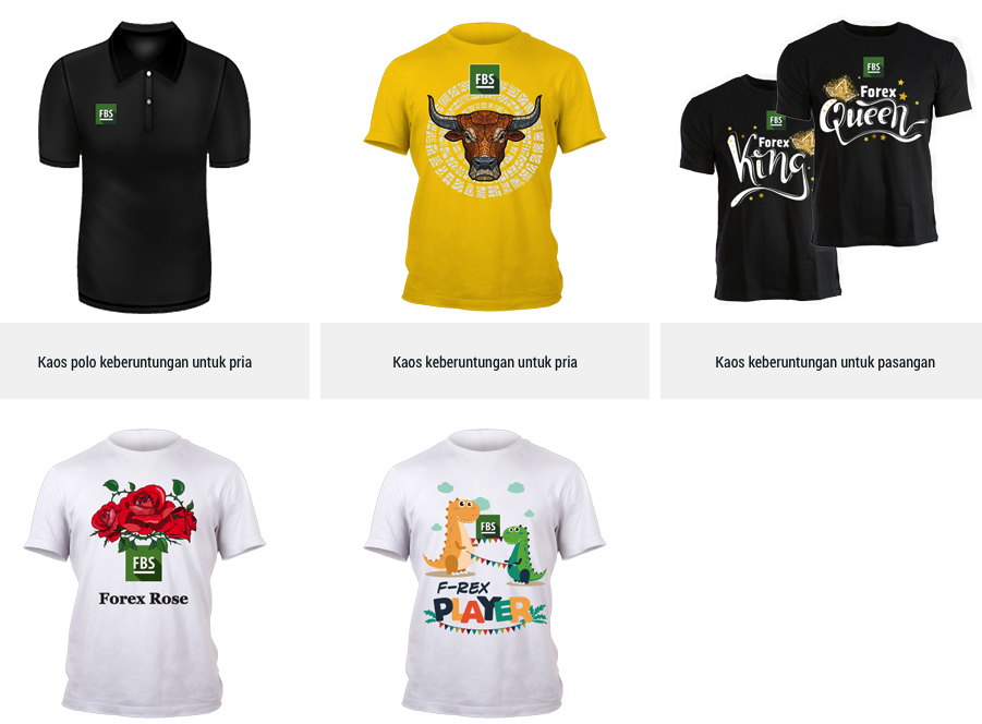 Jadilah trader FBS Indonesia yang fashionable. Deposit sebesar $500 atau lebih, trading 2 lot, dapatkan askes untuk melihat koleksi kaos keberuntungan FBS, pilih kaos keberuntungan FBS untuk Anda, keluarga Anda, atau teman Anda, lalu klaim kaos keberuntungan FBS