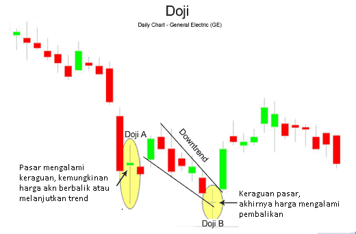 Dalam pola Doji, pasar mengeksplorasi dua pilihan, baik atas dan ke bawah, tetapi tidak dapat melakukan dengan cara baik. Setelah uptrend yang panjang, hal ini nyata keraguan Doji dan dapat dipandang oleh trader sebagai waktu untuk keluar dari posisi . Demikian pula, setelah downtrend yang panjang, seperti yang ditunjukkan di atas saham General Electric, mengurangi ukuran posisi seseorang atau keluar benar-benar bisa menjadi langkah yang cerdas.
