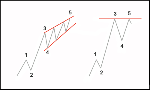 3. Complete 5th wave failure – berlaku untuk  gelombang 5, di mana bisa  terjadi berminggu-minggu itu gagal mengungguli gelombang 3, yang akan menghasilkan formasi double top. (Lihat ilustrasi kedua pada gambar di atas)