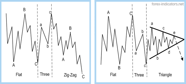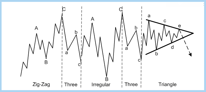 Pola elliott wave pada gelombang koreksi  berbentuk lebih rumit. Gelombang koreksi dapat dikategorikan ke dalam enam bentuk utama: