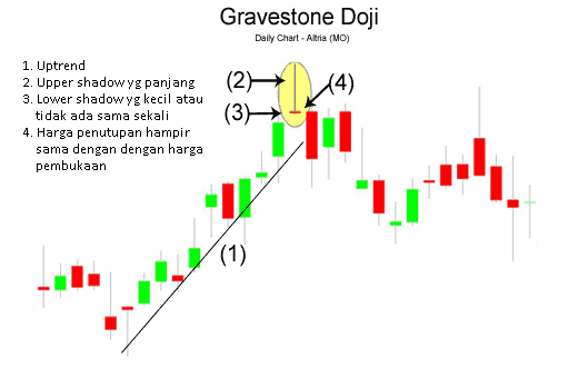 Gravestone doji adalah pola Candlestick pembalikan yang sangat membantu pedagang visual melihat dimana resistensi dan pasokan cenderung berada. Setelah uptrend, Doji Gravestone memberikan sinyal ke pedagang bahwa uptrend bisa berakhir dan bahwa posisi buy harus ditutup. Tapi indikator lain harus digunakan dalam hubungannya dengan Doji Gravestone untuk menentukan sinyal jual yang sebenarnya. Sebuah trigger potensial dapat berupa break teehadap trendline dari uptrend tersebut.