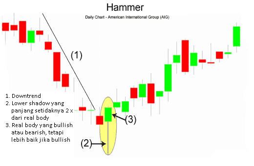 Grafik di bawah adalah saham American International Group (AIG) yang menggambarkan pola hammer pembalikan setelah downtrend: