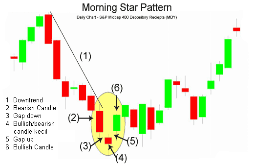 Hari ke-1 pola morning star untuk grafik 400 Midcap (MDY) di atas terjadi sebuah candle bearish yang kuat. Hari ke-2 terus sentimen bearish Hari ke-1 oleh gapping down. Namun, hari ke-2 adalah candle Doji, yang merupakan candle keraguan dalam pasar. Penjual tidak dapat melanjutkan penurunan besar hari sebelumnya, mereka hanya mampu menutup sedikit lebih rendah dari harga pembukaan.