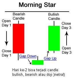 Pola morning star adalah pola pembalikan bearish, biasanya terjadi di bagian bawah downtrend. Pola ini terdiri dari tiga candle: