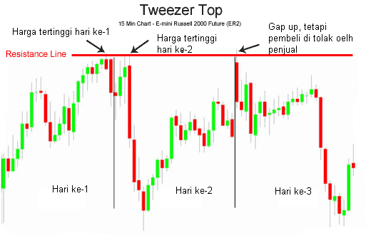 Pada hari ke-1, pembeli yang memegang kendali atas Russell 2000 E-mini. Pada hari ke-2, bagaimanapun, pembeli mulai mencoba untuk membuat harga tertinggi baru, tetapi ditolak oleh overhead resistance yang dibuat oleh tertinggi hari sebelumnya itu. Pasar kemudian tenggelam dengan cepat hanya untuk memulihkan setengah pada akhir penutupan di hari ke-2. Hari ke-3 dibuka dengan gap yang spektakuler, tapi pembeli segera ditolak oleh penjual di garis resistance. Russell 2000 E-mini kemudian jatuh untuk sisa hari itu. chartists klasik banyak yang mengenali tiga tweezer top sebagai pola grafik double top.