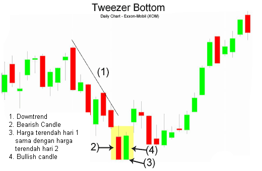 Sebaliknya, sebuah tweezer bottoms terjadi selama downtrend ketika penjual terus mengambil harga yang lebih rendah, biasanya menutup di dekat posisi terendah hari itu (tanda bearish). Namun demikian, hari ke-2 adalah benar berlawanan karena harga membuka dan melonjak ketas. kadang-kadang melebihi dari seluruh panjang candle dari hari sebelumnya.