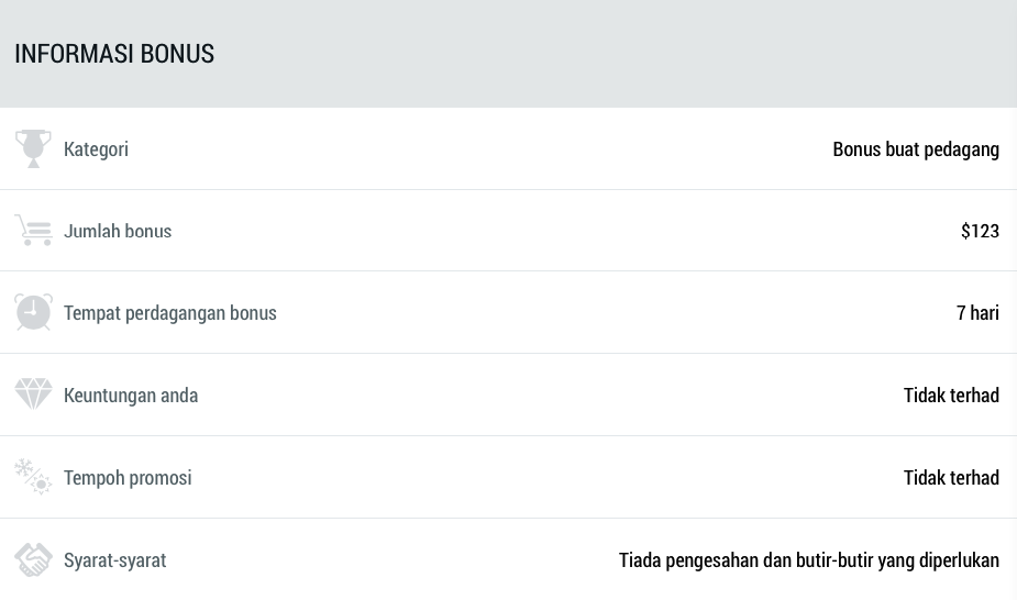- Berdagang selama 7 hari. Dalam masa 7 hari, baki akaun akan menjadi kosong, bonus dibatalkan, keuntungan akan dicatat di dalam laman “Bonus 123$” di Halaman peribadi anda